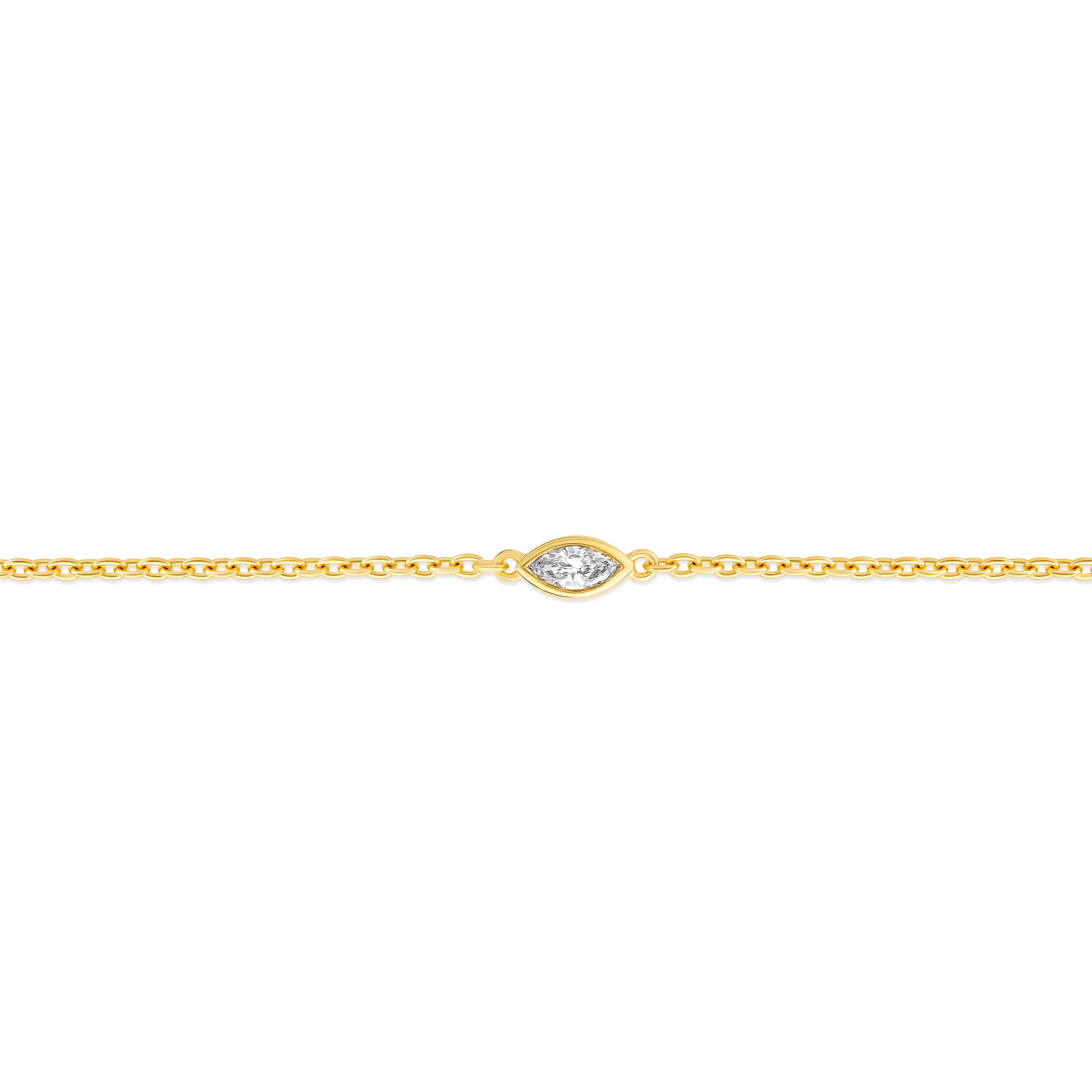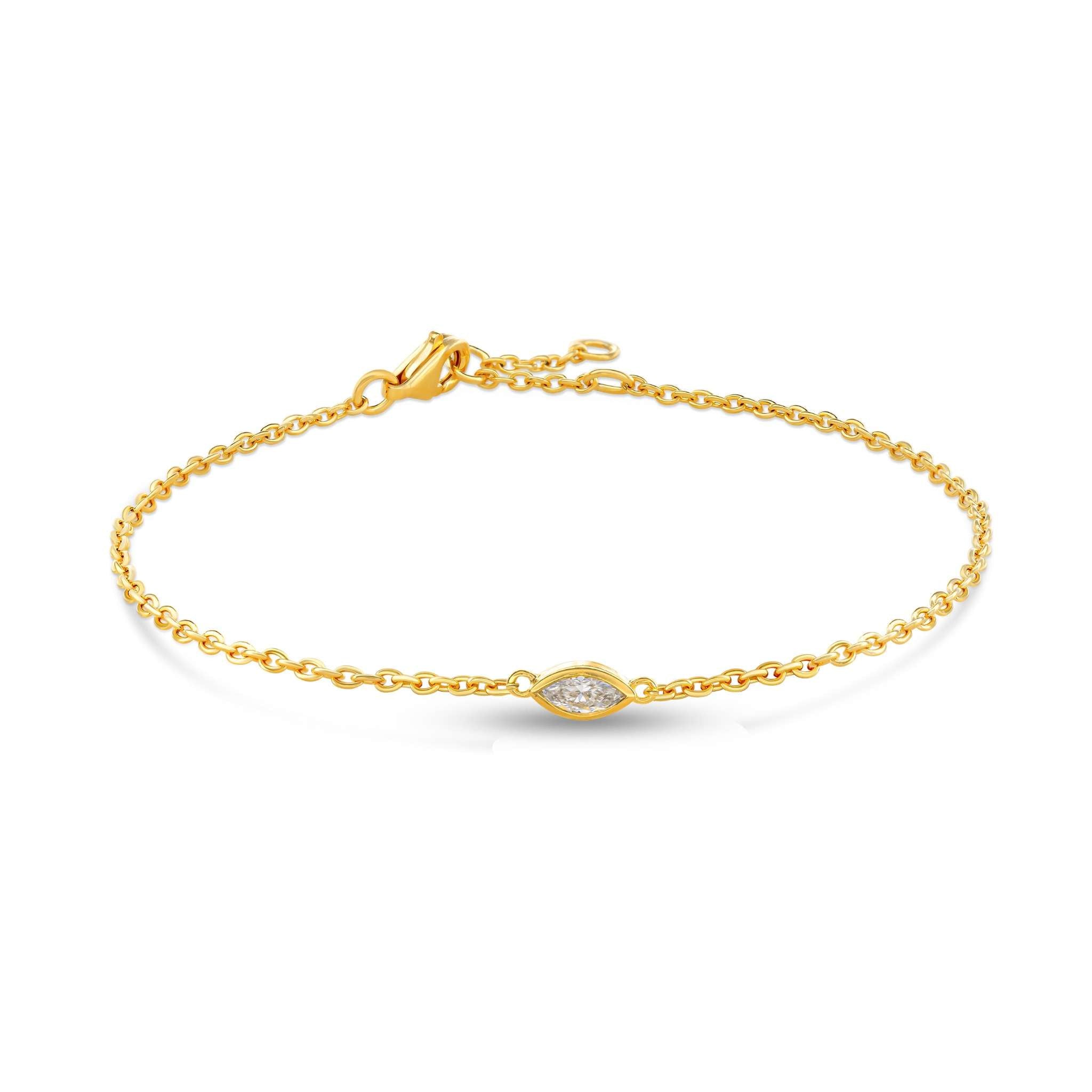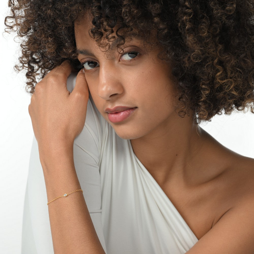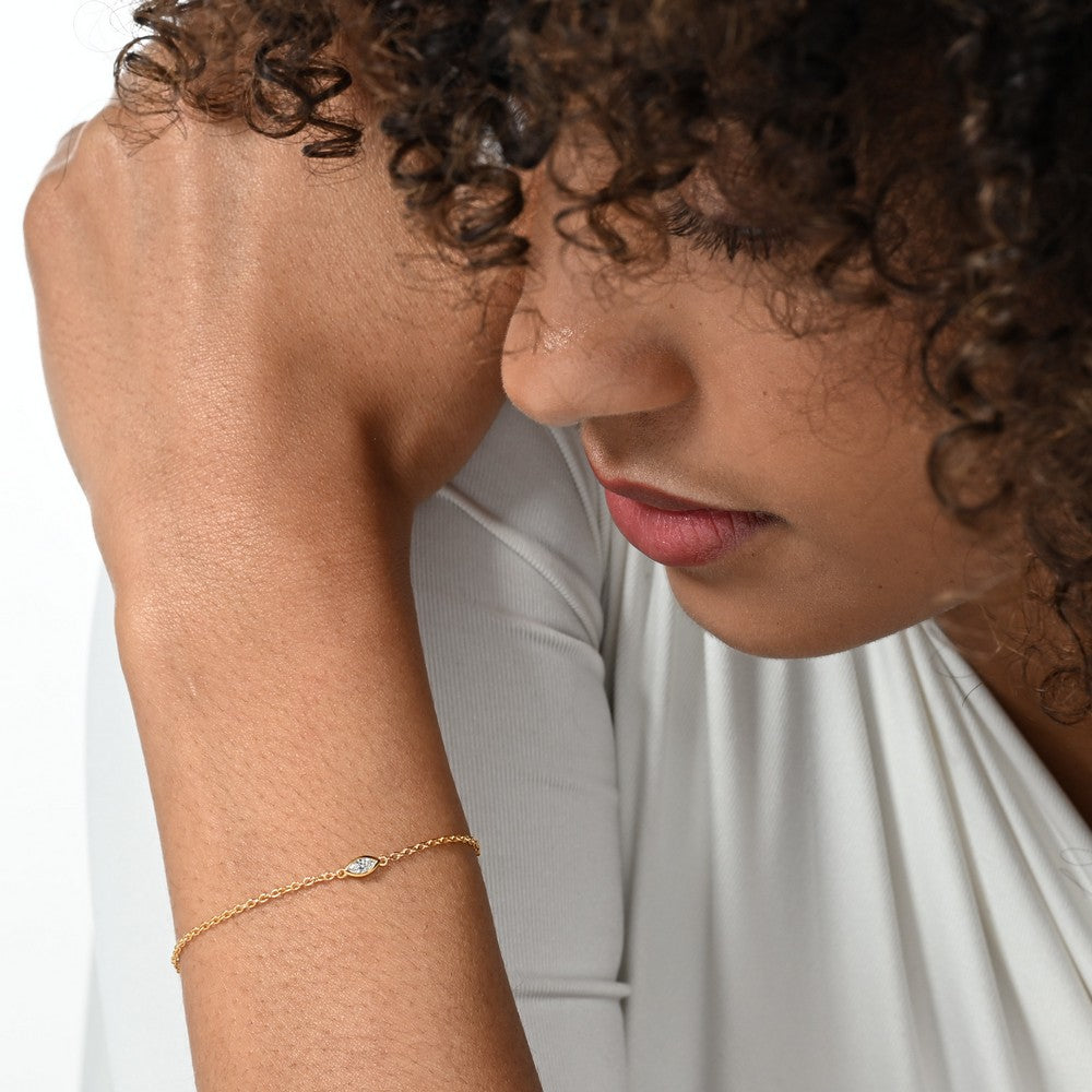Handcrafted in recycled sterling silver with a 18k gold plating and 1 marquise-cut diamond beauty with 0.14 carat. This is Laure, a subtle yet stunning diamond bracelet.