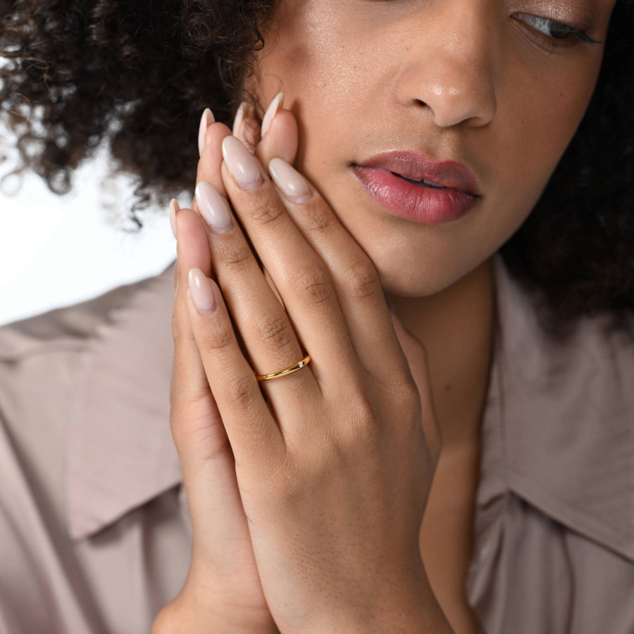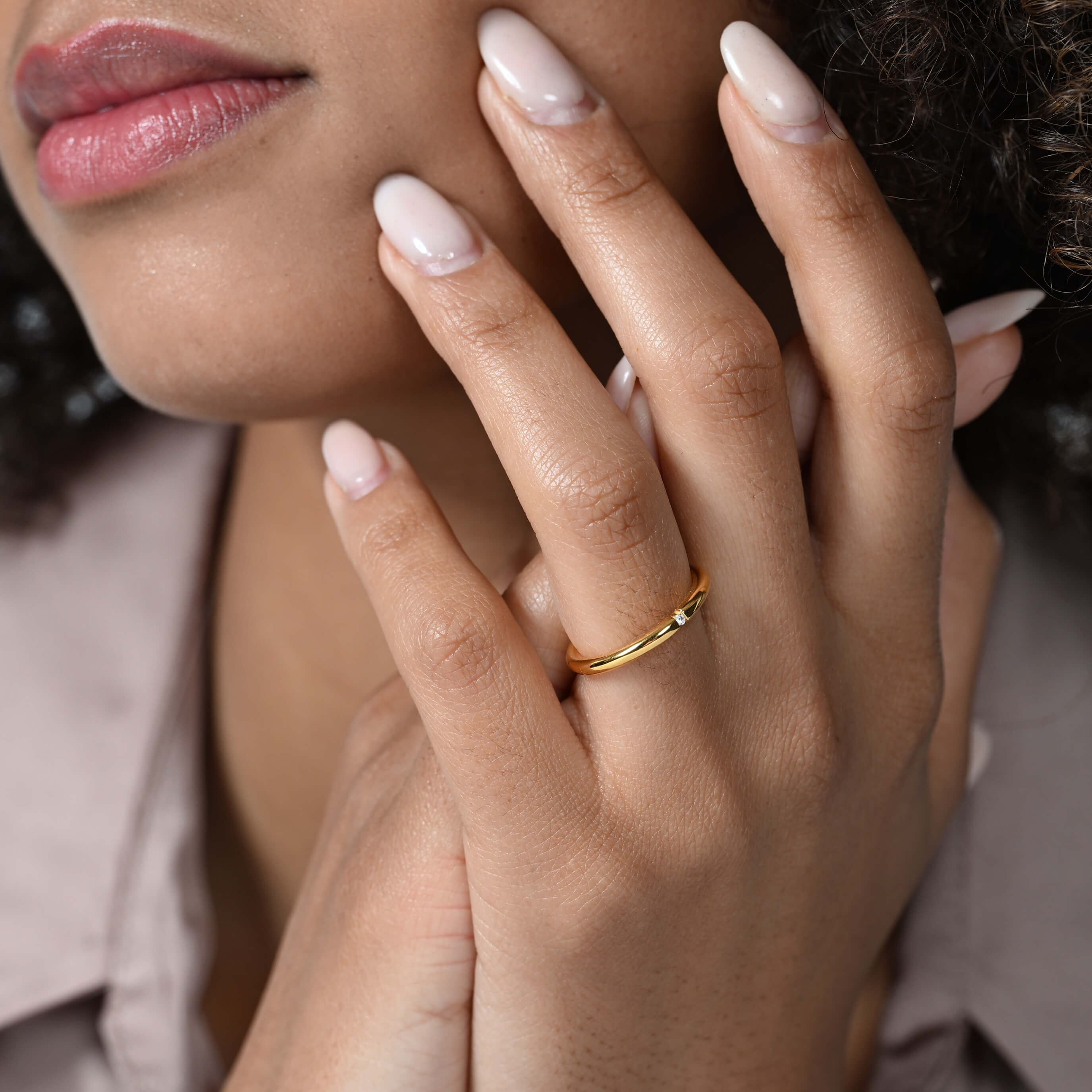 The Lucia ring’s rounded and polished surface gives it a pure appearance. Made from recycled sterling silver, plated in 18k gold and set with a brilliant-cut diamond, the Lucia ring adds a touch of sparkle to your ring stack.